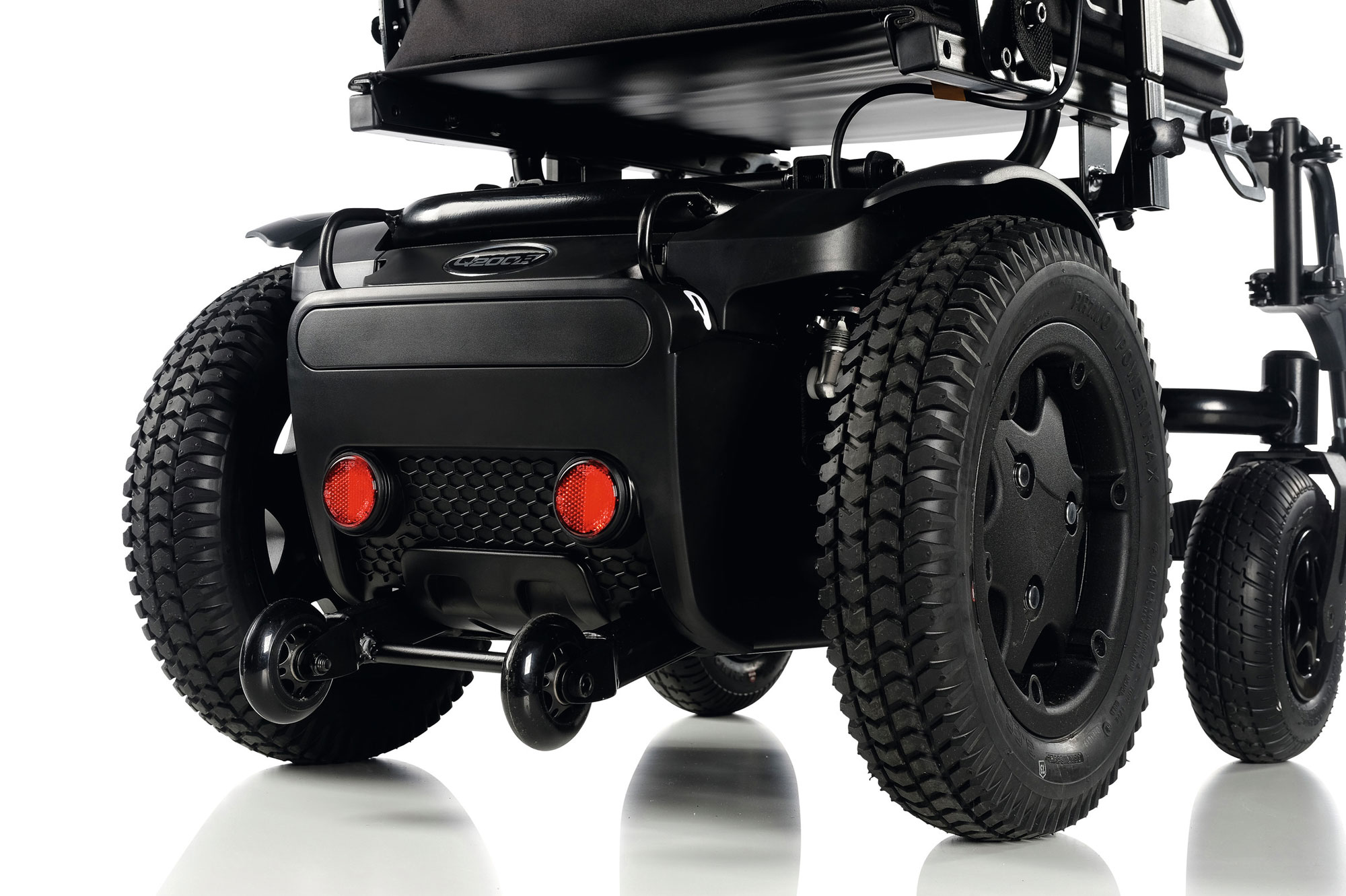 Dzięki dłuższej podstawie o długości 1070 mm, szerokości 580 mm i większym kołom napędowym 14 '' oraz kółkom 9 '', Q200 R zapewnia większą stabilność i przyczepność niż jego młodszy brat. Mechanizm do pokonywania krawężników będzie przydatny podczas jazdy po nierównym terenie, a także pozwoli pokonać krawężniki do 100 mm.
